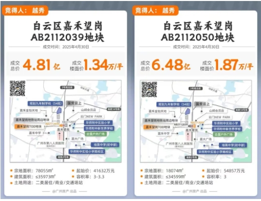 越秀地产分别以4.81亿、6.48亿拿下嘉禾望岗地铁上盖的两个相邻地块
