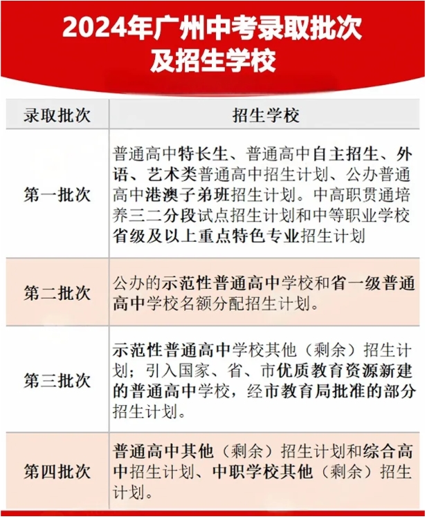 1、2024年广州中考共4个招生录取批次,按上图的从上到下的先后顺序录取,每天二个批次,第一批先录取,第一批录取结束后才进入第二批录取,逐个下推。答:各批次都是独立的,不影响,可以报同一所学校也可以报不同学校。答:因为是按批次先后录取的,所以第一批如果被录取了,就会被提档了,后面批次无法录取。所以前面的志愿(特别是第一、二批)需要谨慎避免被高分低录而后面志愿失效。(被录取了普高补录同样不能参与)
