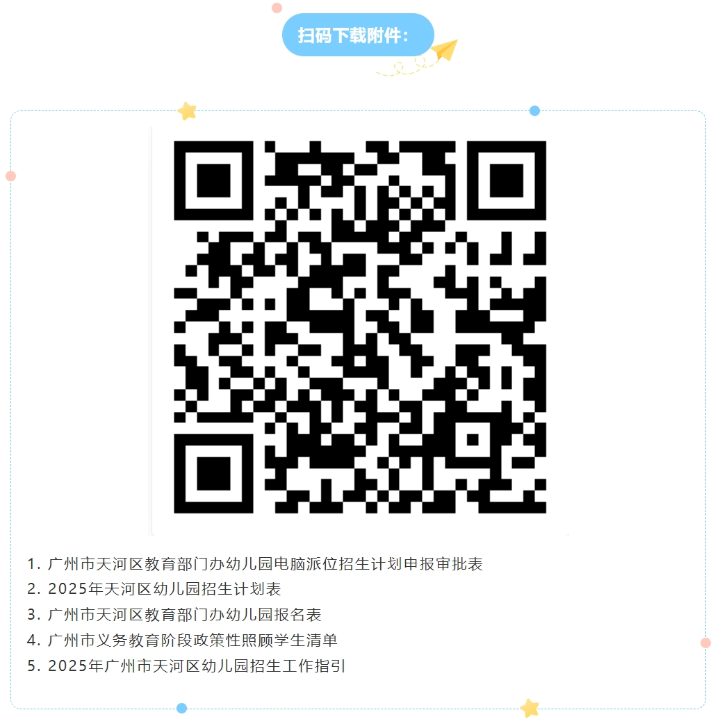 根据《广州市教育局关于做好幼儿园招生工作的通知》等文件的精神,为做好天河区2025年幼儿园招生工作,确保招生工作顺利开展,特制定本方案。 (一)适龄优先。小班的入园年龄为3周岁,幼儿园优先满足天河区户籍适龄幼儿的入园需求。 (二)免试入园。幼儿园招生实行免试入园,除健康检查以外,不得对幼儿和家长进行任何形式的考试或测查。 (三)公正公开。坚持依法依规按程序招生,幼儿园招生严格执行招生政策,做好信息公示,确保招生工作公开、平稳、规范进行。 2025年秋季小班入园的新生应为2021年9月1日至2022年8月31日期间出生的适龄幼儿。教育部门办幼儿园的面向社会电脑派位招生对象还应具有天河区户籍或者符合《广州市义务教育阶段政策性照顾学生清单》(附件4)条件的非穗籍适龄儿童。 (一)教育部门办幼儿园。教育部门办幼儿园2025年面向社会电脑派位招生的比例为90%。其中,教育部门办幼儿园小区配套园区,面向社会电脑派位招生的学位,优先考虑符合条件的本区户籍小区业主子女入园,剩余学位面向社会电脑随机派位进行分配。若面向社会电脑派位招生的学位无法满足本区户籍小区业主子女入园,则剩余的学位继续招收本区户籍小区业主子女入园直至招生比例的100%;若本区户籍小区业主子女超过招生总名额,则由幼儿园在本区户籍小区业主子女中通过电脑派位(或摇珠)进行招录。保障性住宅小区内的教育部门办小区配套幼儿园可结合具体情况进一步细化本园招生方案。 教育部门办幼儿园面向社会电脑派位招生后的剩余学位,由幼儿园自主招生。自主招生遵循以下原则:一是解决幼儿园原招生渠道幼儿的入园需求,自主招生名单由幼儿园领导班子集体决定,向区教育局报备;二是有利于幼儿园健康、稳定发展。 (二)国有企业、事业单位、部队、机关、村集体等其他部门办幼儿园。除招收本系统工作人员的子女外,剩余学位应面向社会公开招生。面向社会招生的比例、方法、流程等由幼儿园的举办部门会同幼儿园具体制订,向社会公布后组织实施。 (三)民办幼儿园。民办幼儿园面向社会招生。若民办幼儿园属于小区配套幼儿园,应优先考虑本区户籍小区业主子女入园。区教育局认定的普惠性民办幼儿园,要按相关规定优先解决军人子女入园,要做好广州市户籍家庭经济困难儿童、孤儿、残疾儿童及其他优抚对象接受普惠性学前教育工作。 (四)特殊幼儿园。具有天河区户籍的中度、重度智力残疾适龄儿童,可申报天河区启慧学校幼教班;具有天河区户籍且办理了残疾证的适龄儿童,可申报天河区华港幼儿园星谷园区或广州市民政局幼儿园金茂园区特教班。请家长于2025年5月18日至5月20日带齐启慧学校或幼儿园指定的资料,携同孩子到启慧学校或幼儿园报名。审核通过后,于2025年5月30日发放录取通知书。 (一)公告 为方便广大家长给子女选择适宜的幼儿园入读,确保幼儿园招生工作顺利进行,各园应在招生工作开始前在本园公示栏等位置,张贴本园的招生简章,向社会公布由教育局核定的招生计划,招生工作结束后,幼儿园要将录取结果及时公开。 教育部门办幼儿园应于5月7日前将本园的电脑派位招生计划报区教育局审核。电脑派位招生计划将通过天河区政府官方网站“天河区门户网站”(网址http://www.thnet.gov.cn/gzjg/qzf/qjyj/zsks/)于5月12日向社会公告。 (二)报名 1. 教育部门办幼儿园小区配套园区。符合优先考虑条件的本区户籍小区业主子女的报名时间为4月19日至4月21日,报名方式为幼儿父(母)或其他法定监护人带房产证或不动产权证、户口簿、出生证、监护人二代身份证等材料到对应的小区配套教育部门办幼儿园进行现场报名。学位按“一户一学位”(相同父母或其他法定监护人的多个孩子不受影响)的原则进行优先登记,即一个住宅单元一个学位,如果学位已被占用(即该住宅单元已有幼儿在幼儿园就读小班或中班),则不符合优先考虑的条件,需另外参加网上报名电脑派位。若业主子女属以下三类情况之一则需对父母房产进行查册:(1)幼儿与父母一起和直系祖辈同住,业主是祖辈,且父母在广州市没有房产或其他居住地的(没有单位分房、自购房、租房等);(2)小区业主是幼儿同父同母的兄弟姐妹,但幼儿的父母在广州无房产或其他居住地的(没有单位分房、自购房、租房等);(3)幼儿的父母拥有不完全房产的居住地是其在广州市的唯一居住地(没有单位分房、自购房、租房等)。 保障性住宅小区内的教育部门办小区配套幼儿园的报名由幼儿园结合具体情况制定。 2. 教育部门办幼儿园。天河区户籍适龄儿童及符合《广州市义务教育阶段政策性照顾学生清单》条件的非穗籍适龄儿童参加教育部门办园电脑派位招生的报名时间为5月13日至5月16日(下午3点),报名方式为网上报名。家长登录“天河区教育部门办幼儿园电脑派位招生服务平台”(网址:http://zs.dominner.com)选择1所教育部门办幼儿园进行报名。报名完成后,每名幼儿将获得一个报名编号,报名编号仅作为幼儿报名标识,与电脑派位录取无关。 双胞胎(多胞胎)参加区教育部门办幼儿园电脑派位可在以下两种方式中任选其一,一经选定不得更改。第一种方式为“一号派位,同园录取”,网上报名必须共用同一个报名编号并备注双胞胎或多胞胎信息,多报将取消录取资格,一旦派中,经审核后办理