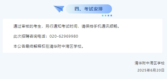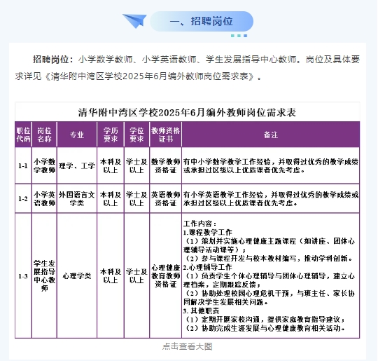 清华附中湾区学校为广州市教育局所属公益一类事业单位,是一所12年全日制公办学校。学校于2021年9月1日正式开学,现有小学四个年级、初中三个年级、高中两个年级。清华附中湾区学校由清华附中负责运行管理,将继承和发扬清华附中“为了每一个学生个性自由全面的发展”的教育理念,持续探索学生个性化培养和创新人才培养的有效途径和方法,坚守办学的初心,逐渐形成自己的办学特色及小学、初中、高中多种衔接贯通培养的办学模式。学校致力于办一所具有中国风骨、流淌清华血液、传承百年精神、适应未来发展、拥有国际品质的新百年名校,办一所老百姓家门口的好学校。为此,学校热忱邀请有志于从事基础教育、拥有教育理想与激情的优秀教师加入。